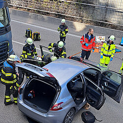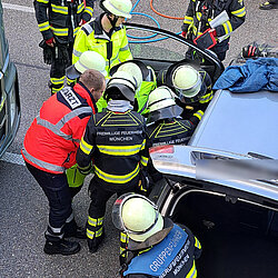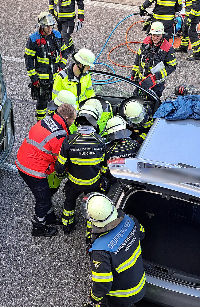 Kurz nach dem Allacher Tunnel in Fahrtrichtung Salzburg kollidierten die beiden Fahrzeuge seitlich auf der mittleren von drei Spuren. Der silberne Peugeot wurde hierbei auf der Fahrerseite getroffen. Während der 29-jährige Lkw-Fahrer unverletzt aussteigen konnte, blieb der 43-jährige Lenker des Autos bis zum Eintreffen der alarmierten Rettungskräfte sitzen. Nach der Beurteilung durch einen Notarzt wurde der als mittelschwer verletzt eingestufte Mann möglichst schonend aus dem Fahrzeug befreit. Hierzu entfernten die Einsatzkräfte mit hydraulischem Gerät die B-Säule und schafften so eine sogenannte große Seitenöffnung. Mit einem Wirbelsäulenbrett konnte der Mann schließlich in den Rettungswagen und anschließend in eine Münchner Klinik gebracht werden.